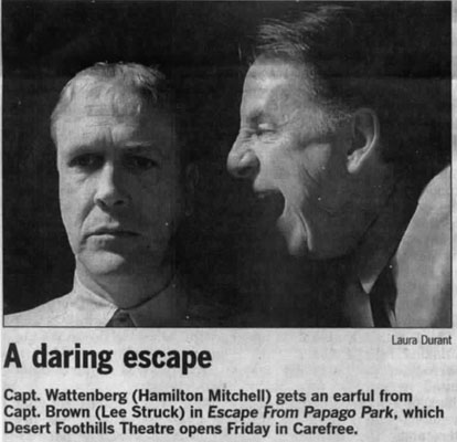 3/11/01: Master Thespian noticed that Lee Struck, also a Herberger Stages graduate, has been cast in Desert Foothills Theatre production of Escape From Papago Park penned by Ben Tyler. It opens this Friday March 16th, 2001. 'Escape' auditions were probably the first time two Arizona Strupp's auditioned for the same play. Apparently, your Master Thespian, being only 50% German, raised by a father who delighted in translating Adolph Hitler's, World War II black & white newsreel speeches into English, wasn't 'German-enough' to get cast! (Just kidding Mr. Barker, sir.) |