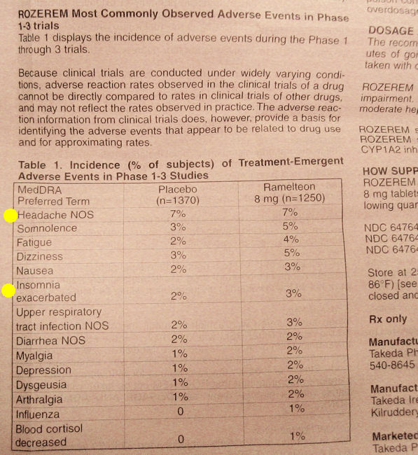 When I did awaken, I felt hungover and discovered a headache dinging around in a part of my forehead where headaches never reside. I had previously read the onion skin document that came with the sample pills and know that an increase in insomnia and headaches are one thing they study and document when developing medicine. And that there is a 33% higher of occurrence of headaches while on Rozerem versus a placebo. (2% vs. 3% equals a 33% increase in headaches.)
