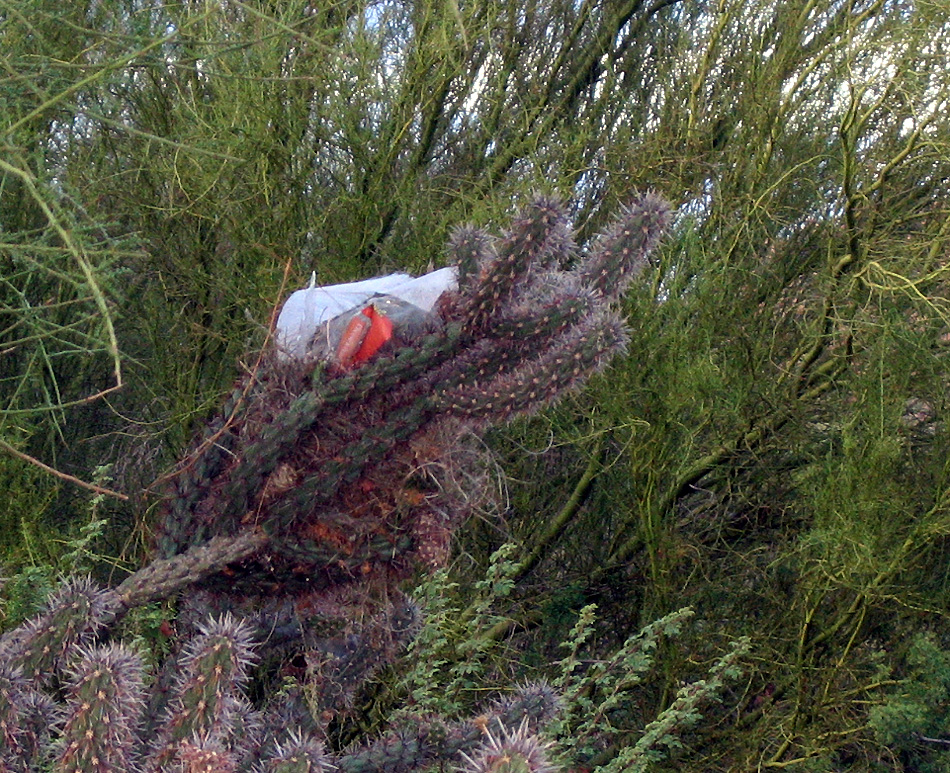 When I examined the Hebrew National hotdog wrapper 'stuck' in this cactus I discovered