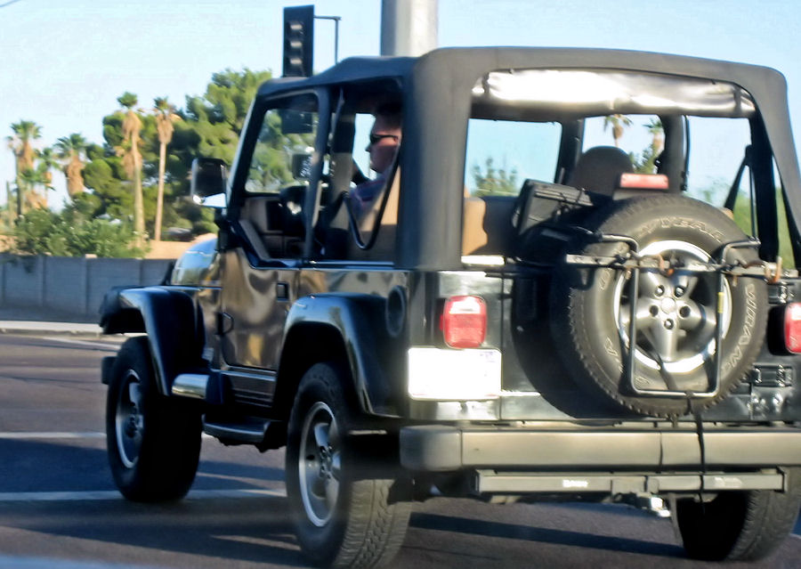 On a pre-work drive to my Desert Ridge Starbucks, where for some reason, the coffee is usually free, (I hope the barristo isn't also expecting a free toot on his meat pipe) this absolute selfish, a-hole, Snottsdale Snippet coming south on 69th Street totally blew through the stop sign at Shea Boulevard to race west on Shea. However he almost got his, as an equally moronic female driver in a vanilla Lincoln Mark VII southbound on 68th place (the very next street west of 69th Street) also ignored her stop sign at Shea Boulevard and was in turn, missed being T-Boned by Jerky the Jeep driver by less than the door-width of a Continental. I would have joyfully forfeited my expected Starbucks session to testify against these self-centered Scottsdale snobs. Note: that while I normally blank out license plate numbers, this one was instead, blanked out by the glare of the 106F degree Arizona summer sun.