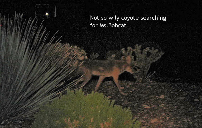 It doesn't make sense, since any adult bobcat would easily slice and dice a single coyote, but here is a coyote looking for a bobcat he chased into the desert. Couldn't get a photo of the bobcat since they can leap six feet straight up and over a wall and are about as photogenic as Howard Hughes.