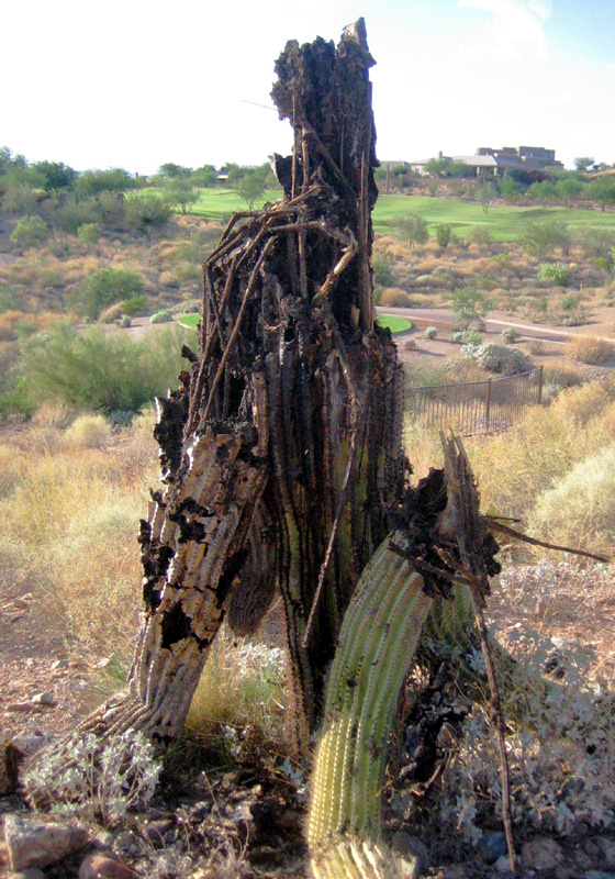 Rip Van Winkle, where it was revealed that the thunder was caused by the gods bowling in the heavens.) Here we see an ancient saguaro cactus reduced to cinders as his placement on the edge of a wide four lane expressway sealed his fate as an organic green lightning rod.