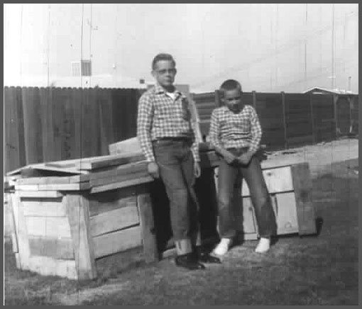 My brother and I pose in front of our backyard fort that he mostly built. Hey, those construction guys didn't need those odd lengths of lumber anyway. Life was simpler then. Note the matching flannel shirts we are sporting and the stylish five inch cuff on my brother's Levi's revealing his black leather dress shoes.