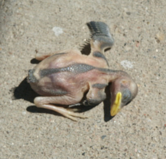 Birds aren't called 'bird-brains' for no reason. About eight times each spring a Sparrow feeding its offspring flies off before letting go of the worm in its own beak, pulling the poor bald birdy out of the nest to plummet to the asphalt below and slowly barbecue on the 130F degree pseudo grill.