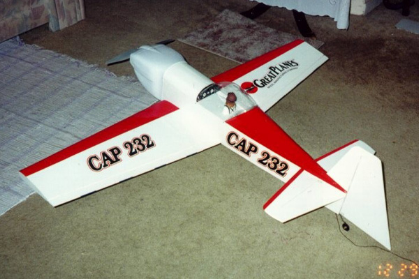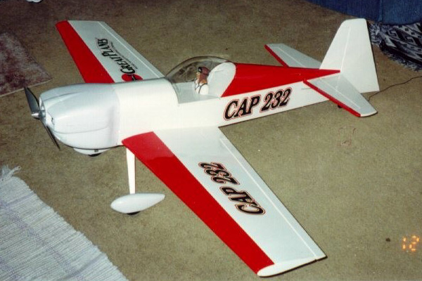 The Great Planes CAP232 equipped with 2 Hitec 225BB and 1 Hitec 85BB servos, Hitec 555 Receiver, 550 mh receiver battery, Aveox F27 motor, Aveox H260 ESC, and 18 RC2000 batteries. All up weight came in at 6 3/4lbs.