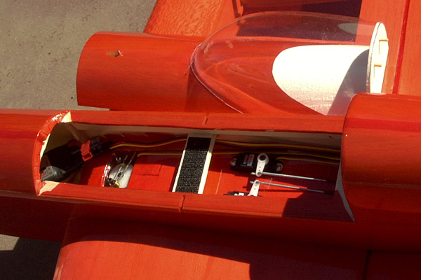 The top hatch makes changing batteries between flight easy. I had to place the servos deep into the wing to keep from blocking the flight pack that site on two ply rails above the wing. |