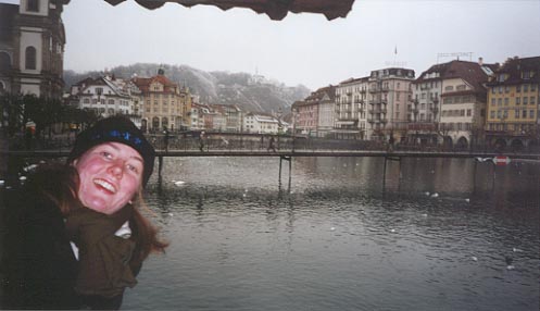 Esther was on the Wooden Chapel Bridge when we took this photo - look at all the pretty houses!