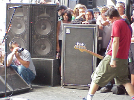 - Mark plays a Fender Custom Shop Precision bass, split into a Mesa