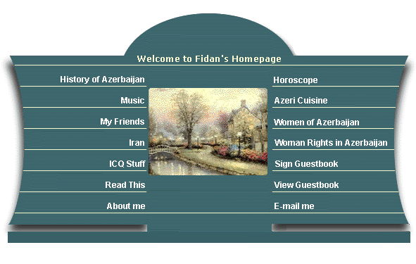 My country Midi Archive Homepages Links & Photos Dictionary What Life is.. Fidan Ali-zadeh Everydaily update Russian/English Famous Women Constitution of Azerbaijan For Questions and Comments For Questions and Comments For Questions or Comments