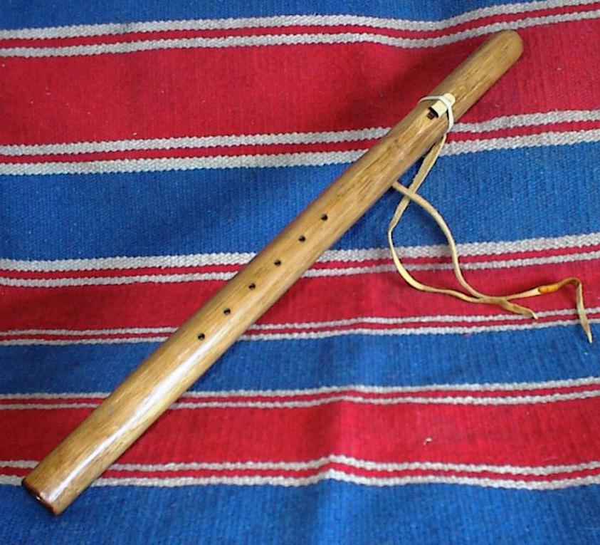 I made this flute out of pine and carved the head of a coyote onto the mouth of the flute so that the sound comes from the mouth of the coyote. I then painted the head and varnished the entire flute.