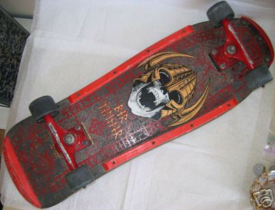 | You know that some kid was so psyched to put this together one day. This is a vintage red and black Per Welinder Street Style complete. It is in really good condition for it's age, and has always had the matching Powell nose and tail bones and rails on it so there is little to no damage one the the board at all. It comes with matching red tracker "sx track" trucks with the plastic baseplates and black Powell Cross Bones wheels. It also has the die-cut grip that a lot of Powell boards came with which is a little dirty, but still in great condition. |
