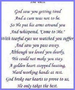 I WENT AND PUT FLOWERS ON YOUR RESTING PLACE AND TALKED TOO YOU FOR A LONG TIME.
