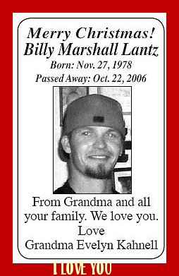 BILLY DID YOU KNOW HOW MUCH GRANDMA LOVED YOU AND ALWAY`S WILL. I WILL NEVER STOP LOVEING YOU AND DANA AND BABY MARLIN.