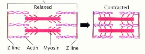 When muscles contract, the myosin has heads which pull on the actin while muscles contract.