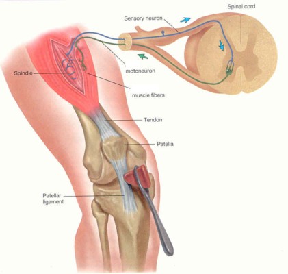 There are some areas of our bodies that when hit by a stimulus, it will contract automatically. This is called a reflex.The ligament attaching the patella to the tibia is one example. Doctors often check this reflex when performing physicals.
