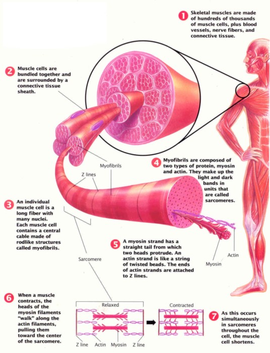 Muscles have thousands of cells which are shaped like strings.The Strings are called sarcomeres.