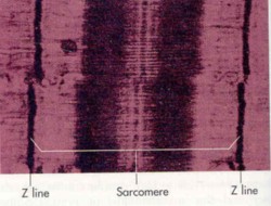 Z lines are visible in striated muscle tissue. When a sarcomere contracts, the Z lines move closer together. When the sarcomere relaxes, the Z lines move away from each other.