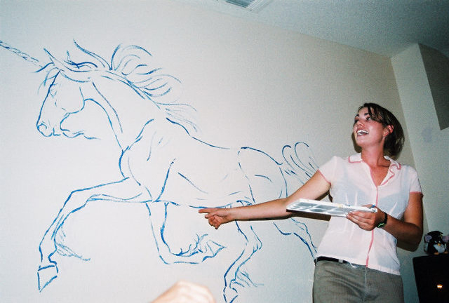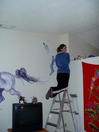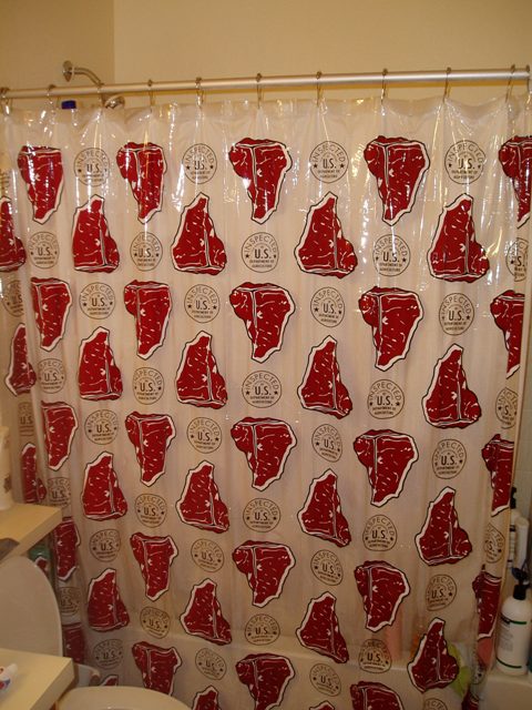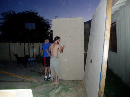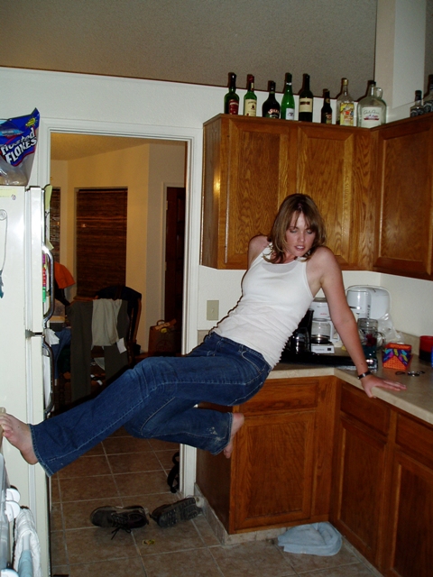 A number of boulder problems in the house. Kitchen Traverse (V--not rated): cross kitchen (use prehensile toes to grab a bottle of beer from the box in the fridge, open it and take a drink, then exit AFTER chimneying the door frame).. problem has a FA but no one has attempted a second ascent (I wonder why).