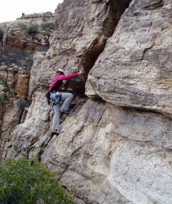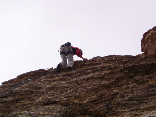Sonja leading over an easy roof at Cochise, she found a crag and just started climbin' up the cracks... 06/05.