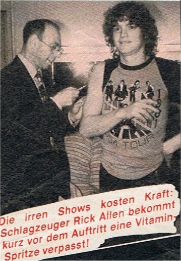 "The wrong power productions cost: Drummer Rick Allen gets missed just before the appearance of a vitamin injection!"