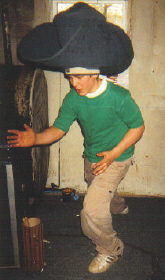 DAN SCREWING AROUND IN HIS BASEMENT WEARING A HUGE HAT. (5/23/03)