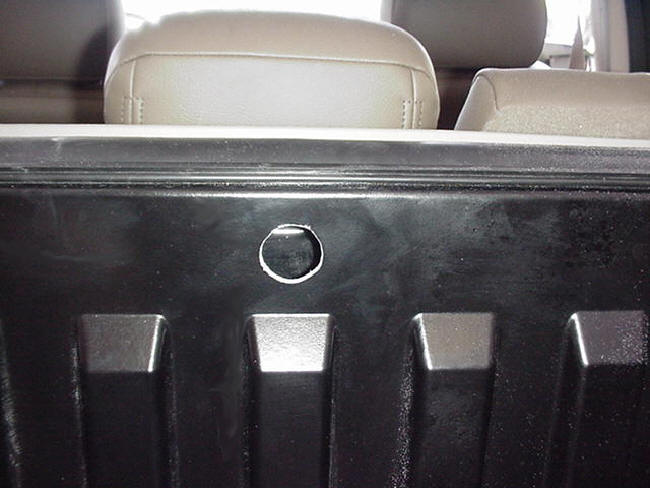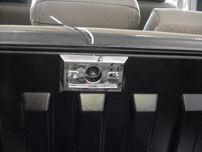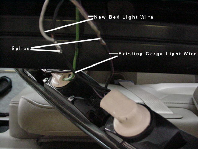Route the wires into the cab, via the rubber access plug (drain plug) beneath the left side sub amp. Proceed up to the top of the headliner, remove top rear plastic trim that holds the headliner. Remove exterior high mount light and route wires in the roof to the cargo light accordingly. Pick either side cargo lamp bulb and parallel splice the new bed light in as shown.