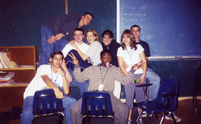 #001 -- Sitting in chairs: Jeremiah B., & Jean Paul E. Left to right: Kevin R., Louis K., Jessica C., Jessica L., Ashley M., Michael T. (Elizabeth M.)