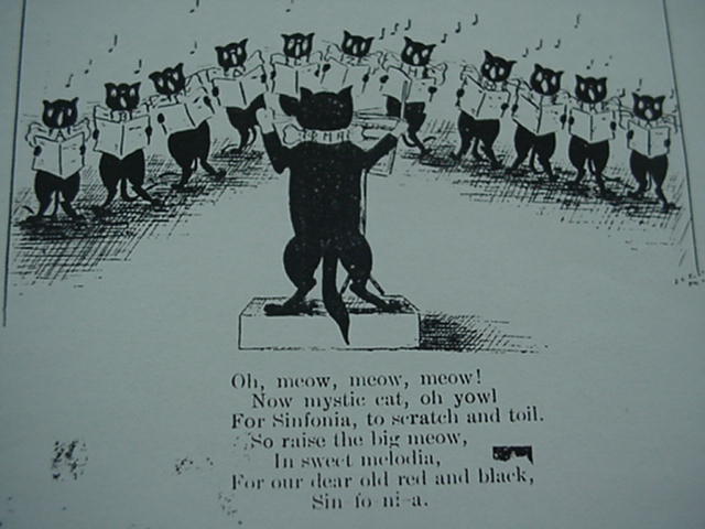 "The Mystic Cat" as it is called is one of the most unknown and mysterious components in Sinfonia history. There are several accounts and stories as to what The Mystic Cat really is. It’s first appearance came about in the 1908 Songbook, which included a song entitled “The Mystic Cat”. Here is the song below: