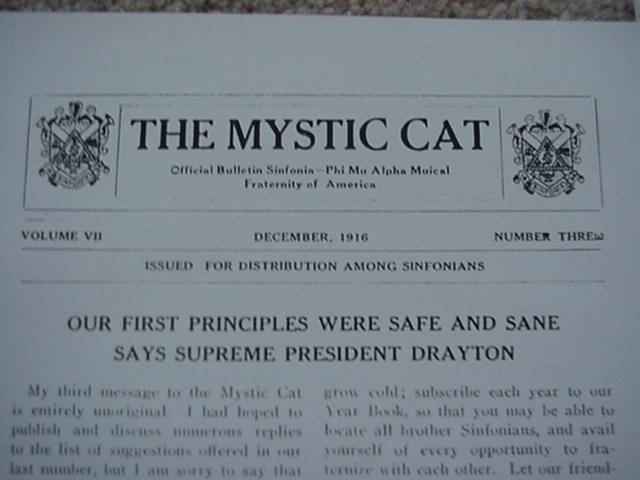 But where the Mystic Cat was mostly recognized was in the form of the Mystic Cat publication, which was a supplemental insert in the Sinfonian Annual yearbook. It covered the news of the fraternity in much greater detail. The newsletter was published three times a year until 1916. In 1915 it became the only fraternity publication, replacing the Annual, and in 1916 four issues were published. However it was decided in the 1916 Convention that The Sinfonian was a more dignified name and the March 1917 issue was announced as the final issue of The Mystic Cat. It’s demise was celebrated with one last poem in the July 1917 Sinfonian.