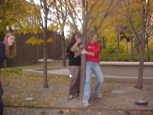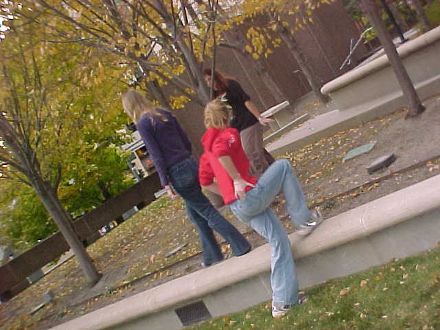 melanie, rochelle, natalie behind a cement thing