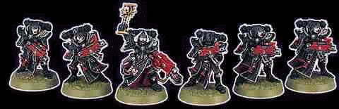 Celestian Bodyguard 55+ 55= 110 Ws Bs S T W I A Ld Sv 3 3 3 3 1 4 1 9 3+ Weapons: 4 Boltguns Melta Gun +10 Characters: Standard Bearer +10 Wargear: Sacred Standard +20 Plasma pistol +15 |