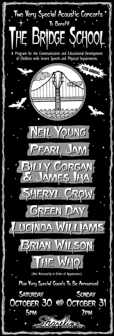 Real Audio files of the complete October 30th and 31st Bridge School Benefit webcasts are available to listen to at Siva. Images to the right [10.31.99] courtesy of plume. View the Bridge School poster here.