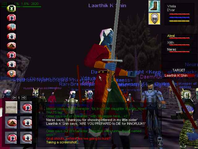 | QUEST INFO | This quest started off one day w/ Lanys , The Child of Innoruuk, shouting to the dark elves to tell of her coming. She tells a few to let everyone know, and to meet her at a specified time. There were over 80 people in the zone in this instance. Laarthik showed up first this time, and gathered the Tier'dal and pretty much works them all into a frenzy for the coming of the Child of Innoruuk Enter Lanys, She tells of armor she much gain to become more powerful.. The first piece is in the Tier'dal's former home(Befallen) Guarded by the "Crimson Tier" We proceeded to venture to Befallen, and while we were waiting for Lanys and crew to show, we killed every creature in the dungeon for her coming Lanys and Laarthik finally arrive, and they start rallying the troops and then Shouts appear from other creatures(Minions of the Crimson Tier).. Telling everyone to leave or be slain.. Of course all the dark elves are hunting for these monsters. Our "Quest" is to guard Lanys with our lives, and slay the Crimson Tier, to gain a piece of armor for Lanys... We escort Lanys and Laarthik to the bottom of Befallen, and at the height of the Shouts and threats from the Crimson Tier.. The whole dungeon respawns, and are agro.. So we set upon killing them.. After we are done with this, Named NPC'S start to show up, and after killing 2 of these, we have fullfilled the quest... For now.. The other pieces of armor are still yet to be found.. |