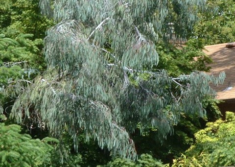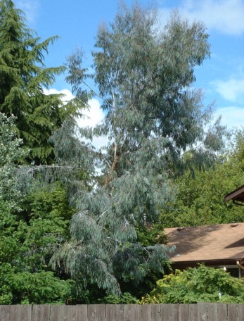This large E. perriniana on Henderson Blvd. in Olympia, WA appears to be at least 10 years old. The main trunk broke off in the ice storm in December 1996, and it has since regrown into a beautiful large tree again already. It was not damaged in the freeze of December 1998 and has probably flowered and set seed by now.