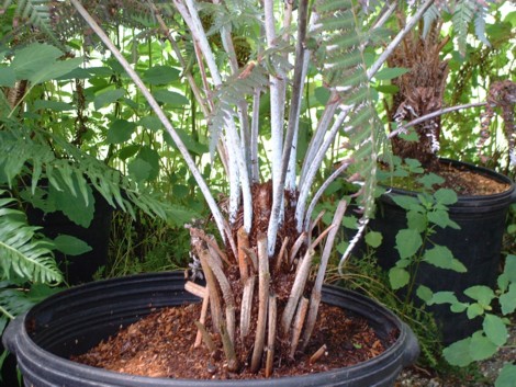Stipes and crown of Cyathea dealbata at Fancy Fronds Nursery. Photo by the author.