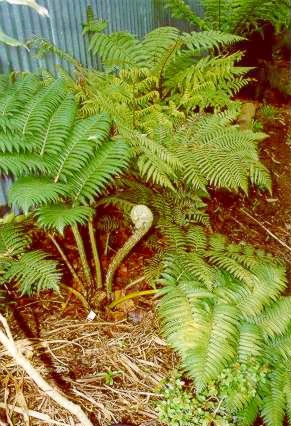 Cyathea robusta is a large, very beautiful species from Lord Howe Island. It has very attractive, thick, erect fronds and light brown scales on the croziers, not unlike C. brownii. As the stipes mature the scales fall leaving the thick, light green stipe visible. The fist-sized croziers of this species are spectacular when uncurling in the spring. A good performer in cultivation, it has been known to withstand frost and snow in Victoria (although cold-tender when small), and is probably a tad hardier than C. cooperi (guessing 25°F). It does not resist hot temperatures well when young either.