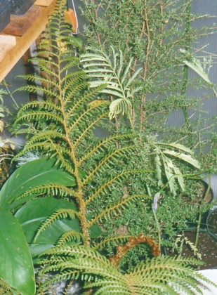 Despite its origin in a perpetually cool climate, it seems to be strangely and remarkably adaptable, in fact one of the most cool- and heat-tolerant tree ferns around. The combination of heat and dryness, however, will be the death of it; but unlike many highland plants it can withstand any amount of heat so long as it has enough moisture. It will do well if kept wet in the summer and also tolerates dry conditions well as long as it is cool. It is also said to do well indoors under cool conditions. Mine has also done well with our very wet winters here in western Washington, and it has tolerated temperatures down to 26°F as a young plant. It may be significantly hardier than this (one source, in fact, reports it has withstood 16°F in Britain), and as far as I am aware the limits of its hardiness have not yet been found. Unfortunately I lost mine in the exceptionally hot, dry summer of 1998.