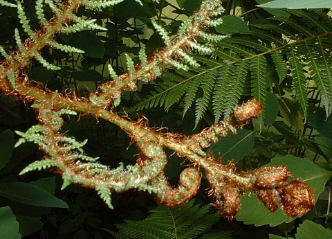 Uncurling crozier of Cyathea tomentosissima at Fancy Fronds Nursery. Photo by the author.