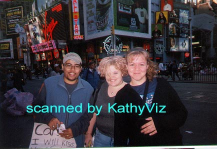 I took this picture of the three of them. THey were very cool peeps. One of the girls was my age (16), the guy was 18 , and the other girl (who was the sister of the other girl) was like 15 or 14. You can see in the backgroud the view of Times Square and if you look really close, you can see the billboard and see Backstreet Boys's Millennium cover in the Billboard and towards the bottom you can Christina Aguilera's front cover of her CD.