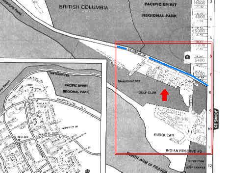 Musqueam Park consists of the 3 crescents that can be seen just off Southwest Marine Dr. (indicated by the blue strip), plus homes nearby along Salish Dr. (above 6100's). This map is simply intended to provide a notion of the general area of Musqueam Park.