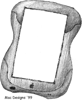 The rest of the package is great too. A 400 Mhz G3 (with 1 MB of back side cache), a 12 x 24 inch TFT LCD screen (capable of millions of colours), 2 USB ports, 2 FireWire ports, 64 MB of SDRAM expandable to 512 MB, Composite Video & Audio In/Out ports, TV tuner card, ATI 128 chip set, IrDa port (with a universal remote controller for DVD movies, TV card, etc.), PlainTalk microphone (built-in), 12 GB hard disk and a DVD 2x drive and a 56k modem! If even looks great too with its poly-carbonate semi-transparent body with two colours of blue and white (same as the G3 blue & white towers). It comes with two pairs of fold-out feet, a pair to hold it up-right as a full page monitor, and another pair to hold it up as a wide screen (both collapse when it is being transported). The machine comes with one small hidden speaker built-in, but was only designed for audible alerts. If you want to hear more than little sosumi?s, go ahead and get the optional speakers. Sure, you could buy some stereo speakers, but they?re nothing like the ones that can come with the package. Two, 2-way speakers, bass, mid range and a tweeter each - all in a matching translucent casing. They snap onto the back of the Mac?s casing for easy storage and portability. Just snap them off and a wire leads to each one - power comes from the Mac, no extra AC adapter is required.