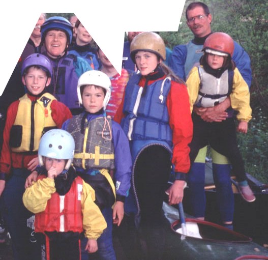 Seth (yellow PFD), Sean (white helmet) and Laurel (brown helmet and blue PFD) are standing, Zoe who's dangling from Pete's arms, and Mariah (who is standing all the way in the front, examining her thumb closely).