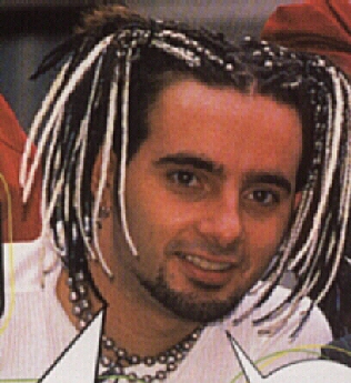 Next you have the wrapped dreads. There were two different looks with theses. First you have the few white ones thrown in with all the black, kind of a, let's add a little 'spice'. Then you have the trademark Chris skunk stripe. (aka white stripe down the middle of his head) Now these I admit are better than the original. I especially like the bandana with the dreads hanging out the back. (yes I may be crazy) I love a guy who can wear a bandana any way he wants and not look like Aunt Jemima's sidekick. You can tell this was the beginning of something.
