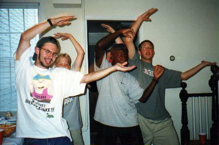 Charles, Nana(w/ cinnamon buns), Kwame, me, Karen, Nora, Ralph, Phil and Danny at the 1999 senior high retreat(March)
