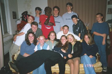 All of us crammed onto/around the couch. We fit all the girls on, which is why I'm laying on everyone. BWAHAHA ~October 1999