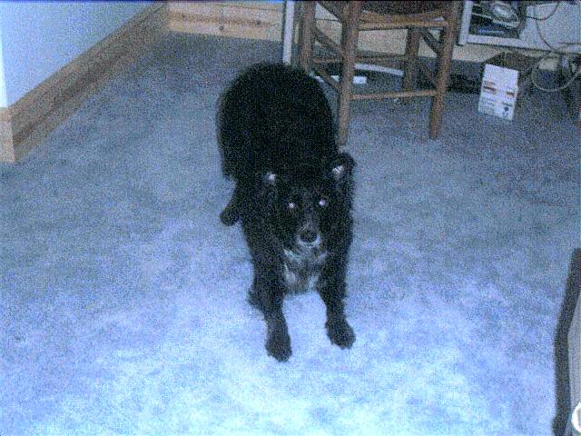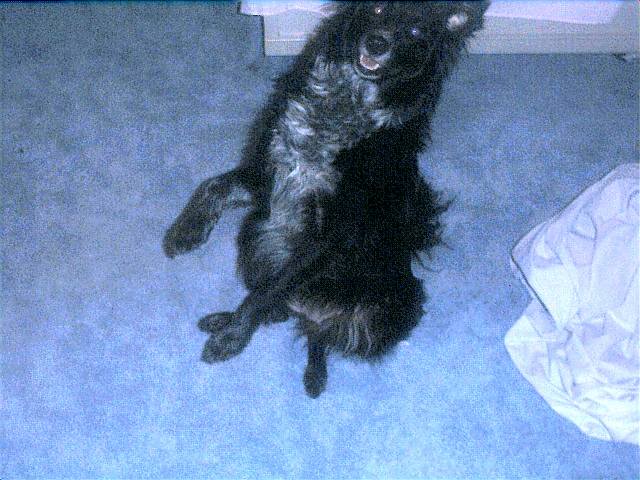 BEG UP This is hard. Place your dog next to a wall, sitting down. Say "Beg Up" (or word of choice) and gently put one hand on her chest, and one on another spot of her body to help her 'Beg up'. Or, if you want, while she's sitting against the wall, hold a treat above her head, so she can beg up, and be having some bites of treats while begging up. Let her nibble on the treats while begging up. A good way to help her balence, is to hold her up against the wall for a while. Not too long. Just about 20 seconds each time. Don't make your Dog beg up too long. Note: that, some Dogs don't have the 'back' for this trick. It might hurt them. So, if your dog is wimpering, or feels unconfutable, don't let her do this trick. not a good picture of me begging.