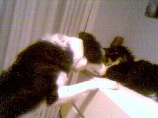 Hiya! My name is Scooter. I'm a 10 1/2 month old ABCA registered Black & White Border Collie puppy. Aren't I adorable? I was born July 9th, 2000. About 2 months later, an ad in the paper was posted about ABCA Border Collie puppies, from working lines. And guess who just happened to see that ad??!! My Mommy!! Yep. About an hour before I was going to be driven to Tampa to be sold to a breeder, my mommy called my doggy mom's owner & asked him if he had any females left. He said yes, there were 2 left. So my mommy drove over and fell in love with me at first sight. Yes, I just amthat cute! Mommy then picked me out and put a down payment on me (Yes, I wasn't cheap!! But, as they say, you get what you pay for!) Mommy said she'd pick me up tomorrow. I was so overjoyed!! Then mommy ran to Pet Supermarket & bought food, a crate, a bed, bones, squeaky toys, leashes and a collar. The next day she brought me home! I got to walk around the biggggbiggggg housie and stare & sniff at a live walking fuzzball! Well, soon later, I found out it was a thing called a cat! Her name's Candie, I'm still fascinated with her. I LOVE to chase her, too. That's my favorite pass-time, herding Candie. Speaking of herding, I feel sorry for my poor doggy mommy & daddy. They gotsta herd sheep with monkeys riding on their backs at rodeo half times. It's a disgrace. But they can't help it! *Sniff*. Anyway. Some of my other favorite things to do are- shred anything in sight, eat carpet (Oooo, I get in big trouble for that!!), rip fur out of Candie's fluffy tail, chew on mommy's heals, eat shoes, scratch through doors, ooo, and yeah, play Frisbee with mommy! Of course, when we play Frisbee, my mommy first throws the Frisbee, I chase after it and keep it; and then my mommy throws a ball, I go & get that, so I have to drop the Frisbee then she throws the Frisbee all over again. Fun, Fun!! OOOoooo!! Food time! Gotta gooooo!! BYYYEEEE! *Munch, Munch*