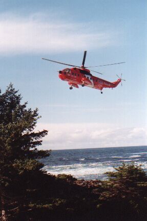 This is a Sikorsky S-61. The largest helicopter that the Canadian Coast Guard has in its fleet. It seats 10 passengers and has a crew of 3. The helicopter is the major workhorse on the coast for hauling freight, groceries, mail, and lifting heavy loads to lightstations. It is also used for search and rescue on the north coast.