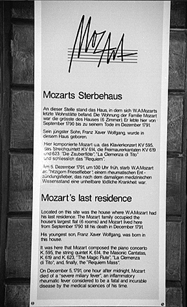 Mozart's last Vienna residence before before his death, City 970, was renumbered 876 and then 934. The house was later rebuilt and the site is now occupied by a depatment store beside the present No.8 Rauhensteingasse.