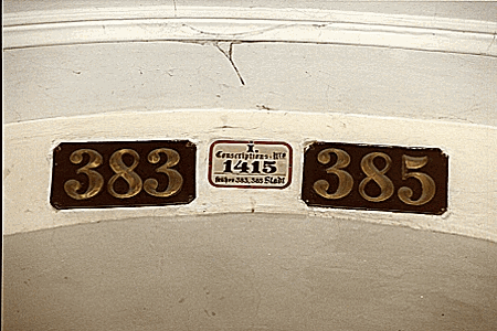 Conscription numbers (not street numbers) were given to houses and palaces in Vienna. These numbers were changed in 1795 and again in 1821 and a small number of these number plates still survive, usually on an arch or wall just inside the entrance. Many buildings also had a name e.g. City 846 were Mozart lived in 1784 was the Camesina House, City 245 in 1789 was the Mother of God and City 970 were he died was the Little Kaiserhaus.